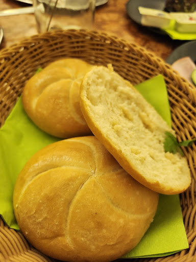 Die Getränke, die serviert wurden, waren in Ordnung. Nach längerer Wartezeit kam ein riesiges, jedoch beinahe leeres Teller auf dem verloren 4 Tomatenscheiben, 4 Gurkenscheiben und drei Karottenschnippel lagen. Dazu zwei kleine Schälchen Aufstrich und 4 Brötchen. So wurde uns dann ein guter Appetit gewünscht. Danach kam erstmal lange gar nichts.