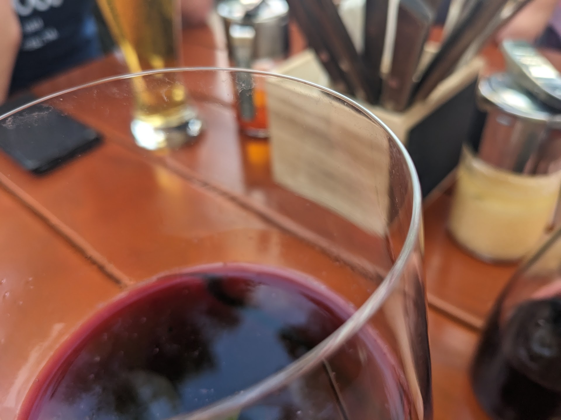 Angefangen hat unser Aufenthalt leider mit einem Kristallweizen statt einem Hefeweizen ( obwohl extra nachgefragt wurde ob es ein Hefeweizen wĂ€re, da schon komisch auf die Anfrage reagiert wurde), einem dreckigen Rotweinglas mit Lippenspuren & Schleierspuren an der Weinkaraffe die sich spĂ€ter als schlechten Wein herausstellten. Die GetrĂ€nke wurden einfach auf den Tisch in die Mitte verteilt ohne jegliche BemĂŒhungen es dem Gast zuzuteilen wie es bestellt wurde ( normalerweise kenne ich es so, dass der Kellner sich bemĂŒht jedem das GetrĂ€nk hinzustellen was er bestellte). Der Kellner des spĂ€ten mittleren Alters mit Brille, war nicht sonderlich bemĂŒht das zu Ă€ndern und ging nur genervt weg, obwohl mehr als sichtbar war das mir dem Wein etwas nicht in Ordnung war ( siehe Fotos). Der Aperol hatte kein gutes MischverhĂ€ltnis und das Bruscetta war sehr ölig.