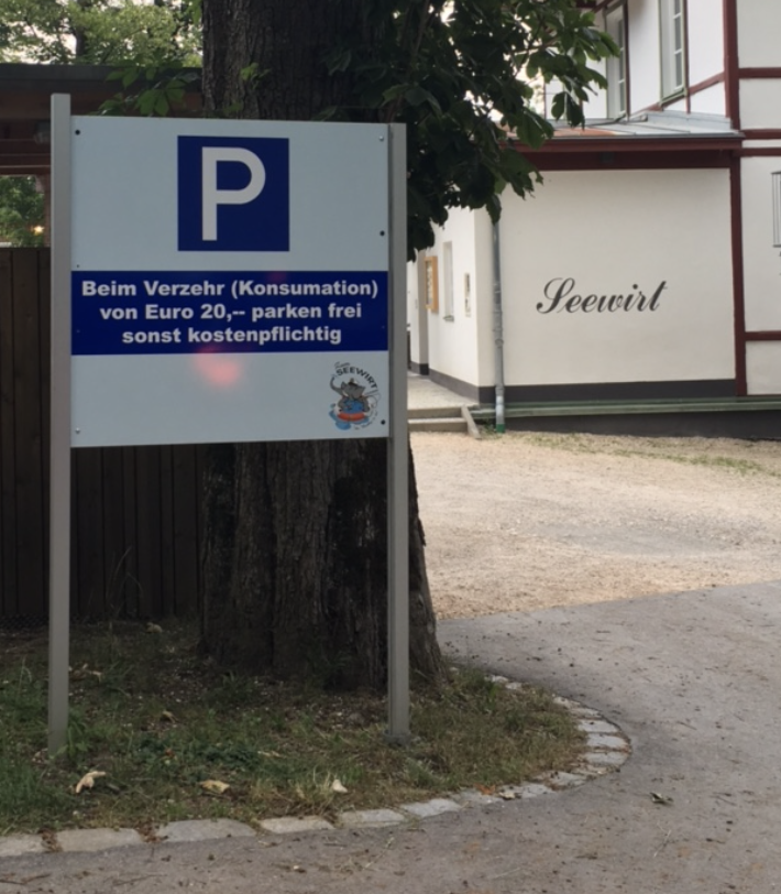 We got ripped off 10€ for parking there 1 hour. The staff and the landlord made it sound like we should be grateful not paying the 20€ as indicated at the entry sign for the parking space. However the sign literally translates into: "Private parking place, for free if you consume for 20€, otherwise fee-based" so the "fee-based" is not further clarified and basically means that you need to pay 20€ regardless how long you have used their parking. Worst part was actually that I approached the staff and the landlord friendly asking for how much I should pay for 1h but they were immediately making fun of me (apparently not the first time that they make money like this) whether I am not able to read signs. But anyway...see yourself the picture of the sign is attached.