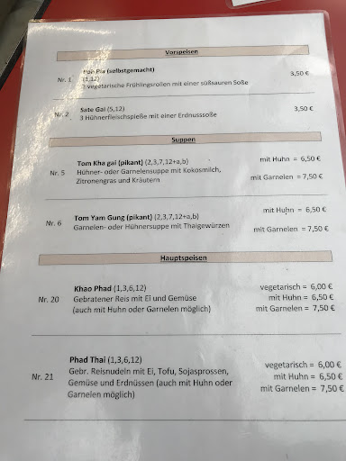 Das war dann mal nix. Bis auf den Reis war alles leider vollkommen langweilig. Das Huhn der Saté war nicht durch bis zu 1/2 roh, die Menge dafür üppig. Saté schneidet man allerdings flach und grillt scharf an. Das war Schaschlik like. Sicher Convenience. Die Erdnuss Soße war ein dünnes, absolut geschmackloses Erdnusswasser ohne Erdnuss. Scharf war alles nicht, nicht einmal ansatzweise würzig. Das grüne Curry war ne Frechheit. Das War Wasser mit nem Schuss Kokos, mehr nicht. Das frische Gemüse hat sich geschämt in so ner Suppe zu liegen. Gute Zutaten sehr langweilig oder besser in schlechtem Handwerk bereitet. Das gebratene Gemüse war etwas würziger, da die Soße rein aus Sojasoße bestand. Minimale Schärfe. Thai ist das nicht. Jeder Bahnhofs Wokladen macht das sicher nicht noch schlechter. Die Orga recht chaotisch oder überfordert.