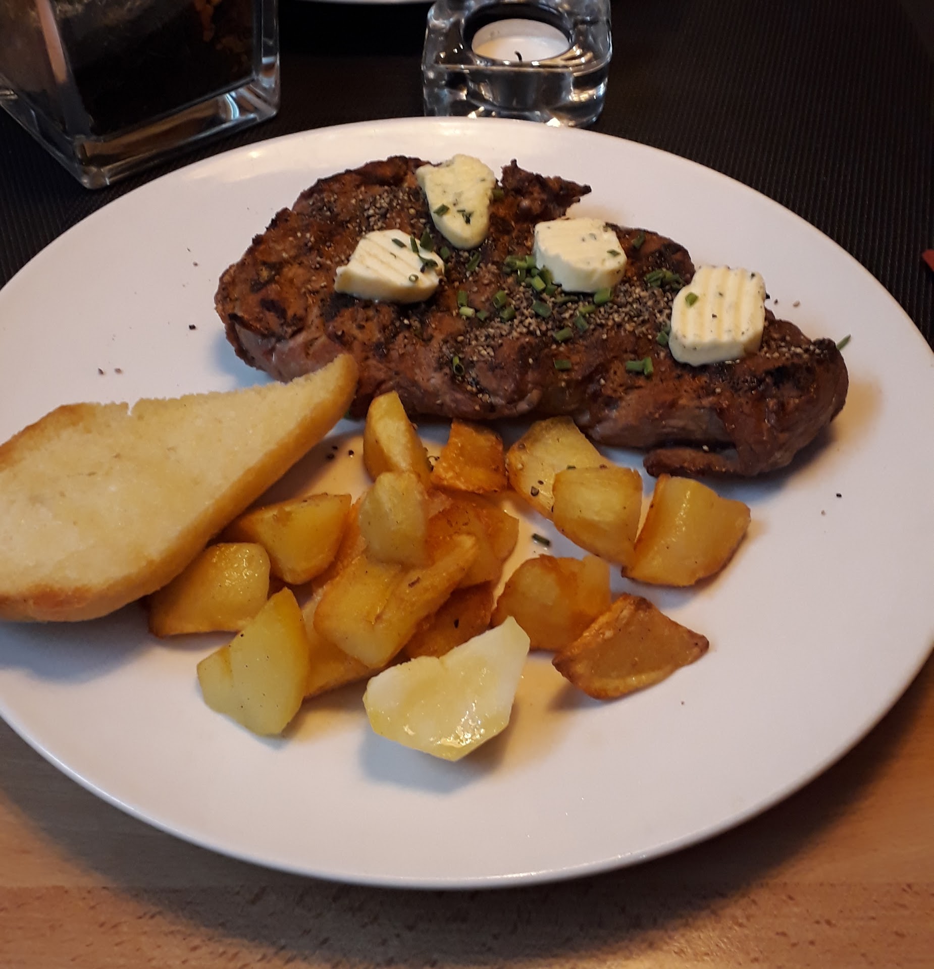 Das Steak war an sich okay, aber nicht so wie bestellt. Es war gerade noch medium - dabei sollte es fast noch englisch sein. Die preiswertesten Pommes die man als TK bekommt und das auch wieder lieblos auf den Teller gepackt. Keine Garnitur, kein hübsches Anrichten - nix. Das bekomm ich zuhause liebevoller und besser hin.