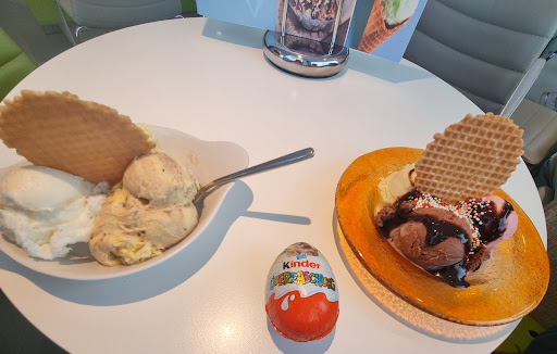 Zum Lokal: Die Eisdiele ist drinnen sauber, aufgeräumt und modern. Es ist alles sehr platzsparend was positiv für das Geschäft ist (Mehr Kundschaft) und negativ für den Gast (man spürt beim anlehen der Bank den Nachbarn hinter sich) Zum Eis: Bilder der Speisen passen leider nicht zu dem was vor Ort angeboten wird. Beispiel: Walnussbecher - Foto karamellisierte Walnüsse / Lokal - Normale Walnüsse. Die Preise sind vollkommen in Ordnung und die Bestellung kam sehr schnell zum Tisch, leider hat man dort auch schon gesehen warum. Die Eisbecher werden vorbereitet und wenn eine Bestellung diesen betrifft hingebracht. Jeder kann sich die positiven und negativen Punkte selber...