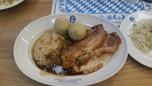 Read moreFür mich keinen zweiten Besuch wert. Das Positive zuerst: Bier lecker, Bedienung freundlich, Restaurant tiptop wenn auch etwas steril wirkend. Aber dann: Haxen aus (kommt wohl öfter vor wie es meinem Sohn auch schon ergangen ist), sorry aber für Frikadelle und Leberkäs geh ich nicht essen. Biergulasch, Wiener Schnitzel, Zander und Schweinsbraten....bekomm ich auch zuhause, da muss ich nicht in ein Lokal gehen das mir bayrische Spezialitäten anbieten möchte, ok Tafelspitz vergessen aber gekochtes Fleisch mit Kren ist auch nicht jedermans Sache. Ich hatte dann einen Brotzeitteller. Der war armselig, eine Scheibe Blutwurst, eine Scheibe Sülze, etwas Leberwurst im Glas und 4 kleine Scheiben Schinken nennt man dort verschiedenem Wurstaufschnitt. Eine Ecke Blauschimmelkäse, Bergkäse (ganz jung, soll heißen mit wenig Geschmack), zwei kleine Radiesschen, eine kleine Gurke, Zwiebelringe und ein wenig Radi und Ende. Die Krönung war allerdings der Obatzda. Sah aus wie ein Fertigprodukt aus dem Supermarkt, aus der Plastikverpackung gedrückt, halbiert und dann serviert. Hat absolut nichts mit der Käsespezialität zu tun die man im Hofbräuhaus München oder auch in Berlin serviert bekommt. Wobei der Geschmack noch halbwegs ok war, die Konsistenz definitiv aber nicht. Sorry liebe Leute aber wenn ich in ein Hofbräuhaus gehe das mit typischen bayrischen Gerichten wirbt dann erwarte ich etwas deftiges, herzhaftes, knackiges und...