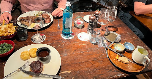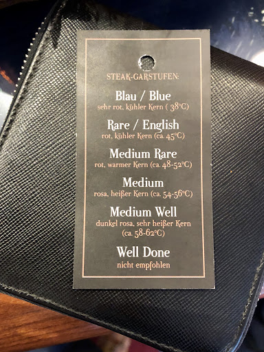 Dann wurde etwas Brot mit Aufstrich gebracht (war sehr schmackhaft) - aber leider auch nicht abgeräumt - auch nicht als unsere Hauptgänge bereits da waren (wir mussten dann selbst etwas abräumen - siehe Foto). Die etwas gestresst wirkende Kellnerin fragte ob wir etwas Platz auf dem Tisch schaffen könnten, damit sie das Essen abstellen könnte. Was ich in so einem Restaurant - zu einem 60-70 € Steak - natürlich erwartet ist ein gutes Steakmesser. Leider Fehlanzeige ! Auch war es nicht möglich (trotz dreimaliger Bestellung) noch zum Hauptgang ein Glas Wein zu bekommen (kam dann als ich fast fertig war). Im Bereich Personal war Quantität vorhanden (wir haben 6-7 Mitarbeiter ausmachen können in einem nicht ausgebuchten Restaurant), Qualität war leider nicht zu finden. Ich möchte dem jungen Mann nicht ankreiden, das er keine Ahnung hatte und das auch alle anderen unaufmerksam waren.