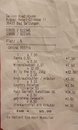 Read moreEs ist lange, wirklich lange her, dass wir so gute Steaks gegessen haben. Selbst meine Frau die nicht so gerne Steaks ißt, war begeistert. Somit ist der nächste Besuch im Road House schon gebongt. Da ist es auch zu vertreten, wenn dort keine Karten zur Zahlung akzeptiert werden. Schließlich erhält man sein Essen, ja auch nicht auf Plastiktellern und das Besteck, ist auch nicht aus Plastik. Jetzt müssen wir nur daran denken, bei unserer Planung, das wir nicht an den Ruhetagen dort auftauchen. Bei den Inhabern merkt man das sie das ganze mit viel Liebe und Spa# betreiben. Das Schild am Eingang"best Steak in Town" ist absolut berechtigt. Wahrscheinlich bekommt man dort die besten Steaks...
