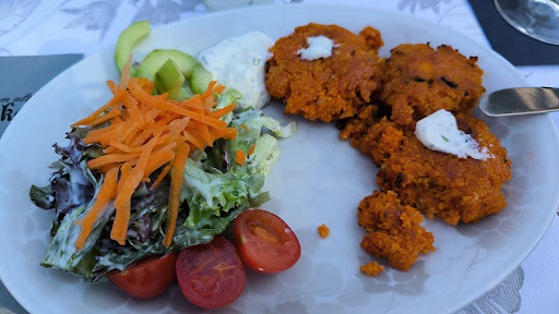 Read moreWir hatten leider eine nicht so gute Erfahrung im alten Weinkeller. Als Vorspeise hatten wir Brot mit Kräuterquark. Das Brot war leider in breite, harte Stücke gerupft und hat nicht sonderlich gut geschmeckt. Da wir vegetarisch essen wollten, hatten wir uns für die Couscous-Taler entschieden, die stattliche 17€ kosten. Bekommen haben wir drei Taler mit ein bisschen Beilagensalat. Dafür ist der Preis wirklich übertrieben. Die Couscoustaler waren mit Ziegenkäse gefüllt, was nicht über die Karte ersichtlich war. Gerade bei intensiven speziellen Käsesorten sollte man dies auf der Karte vermerken, weil schließlich nicht jeder diese Käsesorten mag. Als Dessert hatten wir das Pflaumenkompott und den Schokokuchen. Das Pflaumenkompott bestand aus sehr großen Pflaumenhälften, die man gar nicht mit dem kleinen Löffel essen konnte und einer Kugel Walnuss-Eis, das bereits geschmolzen war, als das Kompott zum Tisch kam. Der Schokokuchen war sehr fest und hatte wenig Geschmack.