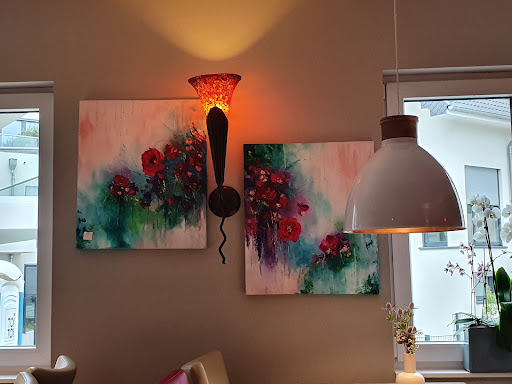 Immer wieder reizvoll ist es, die regelmäßig wechselnden Gemälde an den Wänden anzuschauen, die uns mit ihrer Farbenfreude und positiven Ausstrahlung für sich eingenommen haben. Zwei von ihnen haben wir bereits erworben und an einem schönen Platz aufgehängt, wo sie besonders gut zur Geltung kommen.