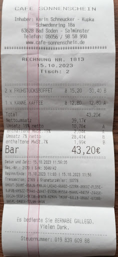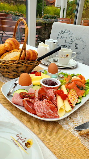 Read moreEin schönes Cafe, gemütlich und hell. Die Bedienung war sehr freundliche, alles wurde genau erklärt, aber eine Karte wurde uns nicht überreicht und über den Preis hatten wir, 2 Personen, auch nicht nachgefragt, was leider, im Nachhinein, ein kleiner Fehler war. Wir nahmen das Frühstücksbuffet. Das Buffet war nicht übermäßig gross, jeweils ein paar Scheiben Käse verschiedener Art, Wurst, Lachs mit Meerettich, jeweils auf Blattsalat, sowie Marmelade, Würstchen und kleine Frikadellen plus Brötchen waren vorhanden. Zudem hatten wir noch Rührei mit Speck und kleinen Tomaten gewählt. Der Kaffee, wir nahmen eine Kanne, waren im nachhinein, nicht mit im Preis inbegriffen. Obst wurde nicht angeboten. Als wir die Rechnung über € 43,20, hatten wir doch geschmeidig geguckt. Eine Karte wurde nicht angenommen, nur Bares. Na ja, Café Sonnenschein, eventuell noch mal über die Preise nachdenken 🤔. War...