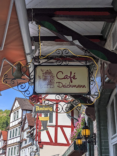 Read moreNach einer Wanderung auf dem Premiumwanderweg P7 ging es am 1. Mai zu einem zweiten Frühstück ins Café Deichmann - bis 12:00 war hier noch das Frühstücksbuffet geöffnet. Der Besuch war kein Fehler: für knapp 14 € gibt es ein kleines, aber sehr feines und qualitativ hochwertiges Frühstücksbuffet. Kaffee- bzw. Tee inkl., also eine Coffein-Flatrate ;-) Rührei wird frisch zubereitet, wenn es zu Neige geht, ebenso wird das Buffet immer wieder in kleinen Etappen aufgefüllt. Finde ich gut, denn so bleibt am Ende hoffentlich weniger übrig. Kuchen aus Eigenherstellung sah gut aus, hatte aber nach dem Frühstück einfach keinen Platz mehr. An den Tischen rundum wurde der Kuchen durchwegs gelobt. Bedienung war freundlich, auf eine gewisse eigene, etwas distanzierte Art - kein Grund zur Klage. Insgesamt ein tolles und nettes Café, das in Bad Sooden-Allendorf zum Genießen und Verweilen einlädt - entweder drinnen oder auch draußen mit Blick auf Blumen und Park. Etwas teurer, aber lohnt sich auf jeden Fall (hier gilt: Qualität kostet eben auch mal ein kleines...