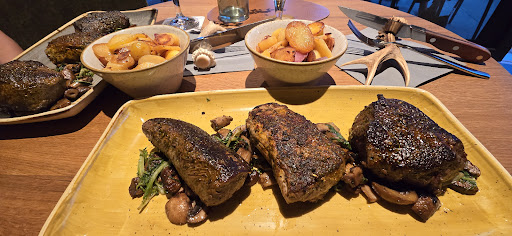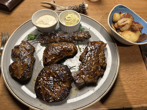 Read moreMal wieder seit längerer Zeit mit Freunden hier zum Abendessen verabredet. Der erste Eindruck war schon ein gewisser WOW Effekt. Das Ambiente der Räumlichkeit, die Beleuchtung und das augenscheinlich bequeme Mobiliar sollten etwas besonderes versprechen. Wir hatten an einem Sonnabend Abend um 19.00 reserviert. Das Ajò Steak & Wild war schon gut gefüllt. Ich fühlte mich ab der ersten Minute sehr wohl aufgehoben. Die Bedienung ließ auch nicht lange auf sich warten und begrüßte uns in angemessener und sehr höflicher Form. Den ganzen Abend durch, wurden wir von drei sehr netten und stets freundlichen Frauen bedient. Das Speisen & Getränke Angebot ist sehr vielseitig, natürlich im Fokus des Restaurant Namens. Die Auswahl an Vorspeisen, Hauptgerichten, Nachspeisen und der Getränke ist übersichtlich und leicht verständlich gestaltet. Dennoch nahm sich die Bedienung sehr viel Zeit für uns und ging vereinzelt auf Wünsche und Empfehlungen näher ein. Immer wieder wurden wir gefragt ob wir zufrieden sind und ob wir weitere Wünsche haben. Nach nicht langen warten, kam die Speisen für uns alle auf einem schicken Speisewagen angerollt. Es wurde sich auch hier Zeit für uns genommen um noch einmal im Detail auf jede Speise eingegangen und erklärt. Gerade in meinem Falle, da ich den Grillteller bestellt hatte, der mit vielen Fleischsorten und Zubereitungen angerichtet war. BTW die Portion ist wirklich groß und dem Preis definitiv gerechtfertigt. Die Qualität des Fleisches war für mein Empfinden sehr gut. Auch die von mir als Beilage bestellten Bratkartöffelchen waren hervorragend und lecker. Das Feedback meiner Freunde war ebenfalls durchweg positiv. Der größte Teil bestellt lecker Steak. Wer die Chance nutzen will nutzt vorher ein Blick auf die Online Speisekarte und bekommt hierbei schon einen Blick in die Kostbarkeiten. Alles in allem war es ein sehr schöner Abend an dem an nix gefehlt hat und alles sehr stimmig war. Ich empfehle es deshalb aus meiner Sicht und bedanke mich noch einmal hiermit beim gesamten Team Ajò...