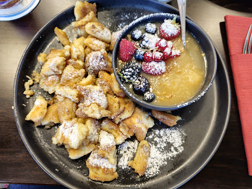 Read moreSehr schöne neue Lokation! Geschmackvoll und Hochwertig eingerichtet. Der Ausblick aus den großen Fenstern (leider auch bissl schmutzig) nicht so schön. Eine Mülltonnenabdeckung oder mehr Orchideen wären vielleicht hilfreich. Kaffee super. Frisch gepresster Orangensaft war schon vorbereitet. Orangenpresse in der Bar wäre toll. Mein Hund hat leider nichts zum Trinken bekommen...Birchermüsli auf eigene Art war hübsch anzusehen, aber nicht gut. Der Tiefkühlbeerenmix, der das Müsli so hübsch lila macht, hatte sehr viele Kerne, die mir lange in den Zähnen hingen. Das Müsli hatte keine Nüsse drin und es war mir zu sauer. Mein Eindruck ist, da wurde Geld gespart und das finde ich immer schade, wenn man fast 5,- Euro für ein kleines Schälchen zahlt. Ich bin gespannt auf das weitere Essen im Kurcafe. Das Ambiente und die Preise versprechen...