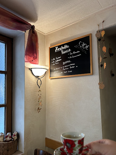 Read moreUm mit dem positiven zu beginnen, die Torte war geschmacklich ganz in Ordnung (Joghurt Sahne Torte und Himbeer Sahne Torte) Leider war dies das einzige positive an unserem Besuch. Im Café war es sehr schmuddelig. Auf allen Tischen befanden sich noch die Reste vom Frühstück am Morgen, die Tischläufer hatten unabhängig von den Brandlöchern, sicher schon lange keine Waschmaschine gesehen. Eine Schar Hühner hätte keine Mühe gehabt vom Boden satt zu werden. Die Servicekraft war freundlich, hatte es aber noch nicht geschafft das ganze herumstehende Geschirr des kompletten Tages zu beseitigen. Wir mussten unseres auf dem Tisch stehen lassen. Wir können entgegen den anderen Rezensionen keine Empfehlung aussprechen und würden auch nicht noch einmal...