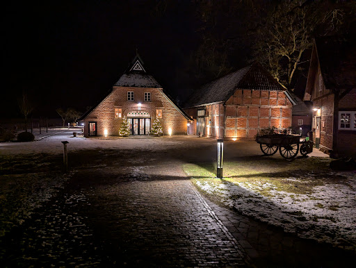 Der Hof liegt direkt gegenüber vom Ahrenshof und bietet sehr gute Parkmöglichkeiten, kann aber auch mit dem Rad prima angefahren werden. Das Grundstück ist sehr gut gepflegt und von hohen Bäumen (Eichen) umgeben. Die gesamte Lokalität ist barrierefrei, es gibt auch eine entsprechende Behindertentoilette.