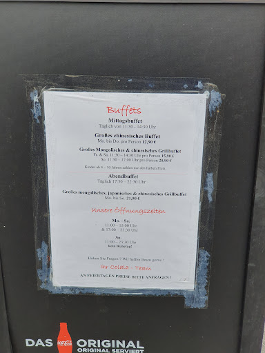 Mittagsbuffet: Täglich 11:30 - 14:30 Uhr großes chinesisches Buffet Mo - Do 12,90 € großes mongolisches & chinesisches Grillbuffet Fr & Sa 15,90 € & So 11:30 - 17:00 Uhr 20,90 €