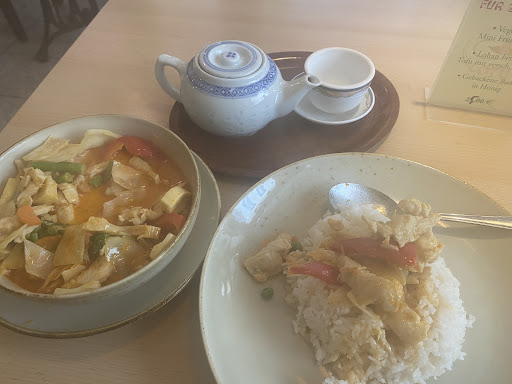 I got the Thai special for lunch, which was chicken Thai curry with rice for 10 euros. First and foremost, it was tasty! The chicken pieces were juicy and flavorful. Anytime I order chicken Thai curry in the Bay Area, they always give me dry chicken breast meat. But here, the meat was not neglected and the curry taste excellent. The curry reminded me more of Vietnamese style rather than Thai—sweeter taste. I believe the owners are Vietnamese because 1. They had Viet music playing in the restaurant 2. I heard the owner bickering in Vietnamese lol This place is family owned and friendly. I saw their school aged son stop by for a quick lunch before walking back to school. How much more family can that get?