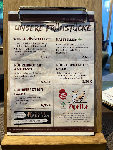 We used Google image to translate the menu (see photos) and opted for the €7.65 breakfast - with salad, cheese, ham and two fresh bread rolls. We also ordered a cake and two medium coffee (€3.30 each) which comes to a total of around 18€ for two people (see image). We were very satisfied and would not have been able to eat more food.