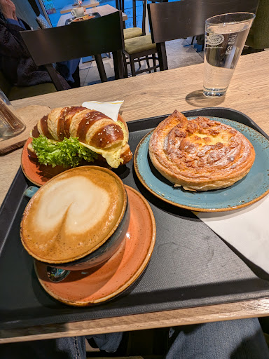 There is a large bakery section and everything looked really good (different kinds of bread, pretzels, buns as well as cakes). I was craving a big breakfast and got the Mediterranean breakfast which is a tomato and cheese omelette served with 2 rolls (I don't know why they give you 2 - I couldn't even finish one as they are quite big). That was around 9 euros and the omelette was huge, 3+ eggs I would estimate. My cappuccino was pretty good too.