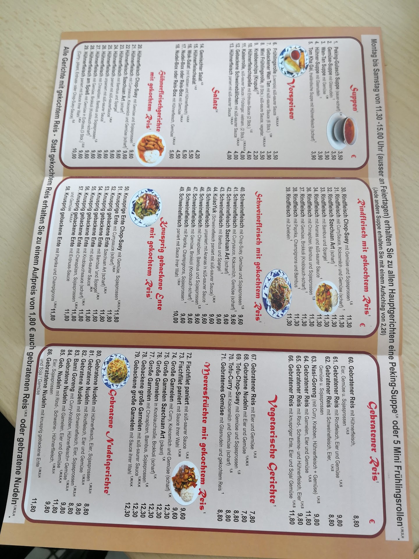 Read moreWir sind eher durch Zufall auf diesen Asia-Imbiss gestoßen, da unser eigentliches Ziel geschlossen war. Es hat sich als Glücksfall herausgestellt. Das Essen war sehr lecker und die Portion riesig. Der Imbiss war sauber und die Bedienung freundlich. Den Punktabzug gebe ich, weil es im Imbisd fürchterlich kalt war. Bei Aussentemperaturen um die 0 Grad C waren es drinnen vielleicht 10 -12 Grad... Das ist eindeutig zu wenig. Aber das Essen war wie bereits geschildert super. Daher zum Mitnehmen oder bei höheren Temperaturen sehr...