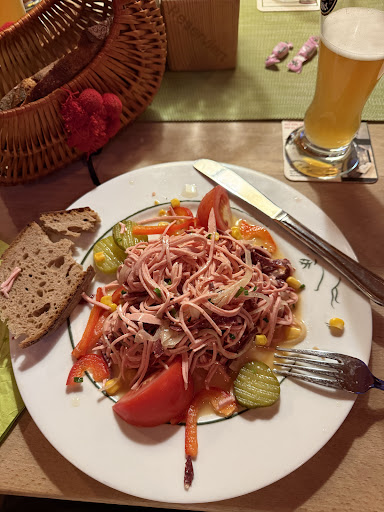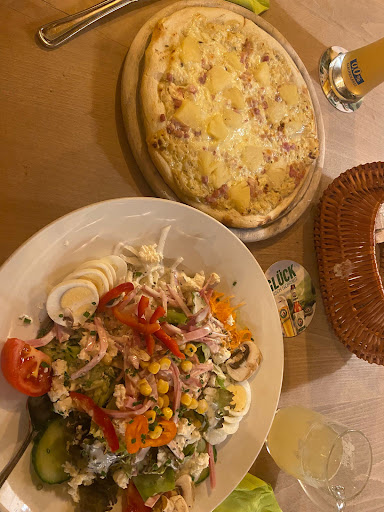 Wir sind um 19:30 angekommen um eine Kleinigkeit zu essen. Da drinnen nichts mehr frei war, sind wir trotz kühlen Temperaturen draußen gesessen, wir wollen ja auch nicht lange bleiben. Dann ging es geschlagene 10 Minuten, bis wir eine Karte bekommen haben und Getränke bestellt haben. Nach nochmal 10 Minuten kamen die Getränke und wir haben bestellt. Zwei Suppen und einen Salat und einmal Maultaschen. Dann ist 40 Minuten gar nichts passiert.