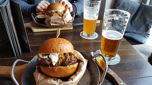 If you want to go there at the usual dinner hours, reserve beforehand! This is a great restaurant with an attached brewery. Their beer selection is varied, but they do run out of some options. Not to worry, they will have plenty alternatives. Their beer book really illustrates their commitment to brewing, detailing history, process, types and taste profiles. The food is also really good. I had a burger from the special menu and the meat was juicy on a ginormous bun that was able to keep its shape. The sweet potato had good crunch and an excellent taste. We rounded it up with their apple crumble and a seasonal dessert with peanut butter. Both were great. I highly recommend this place and...