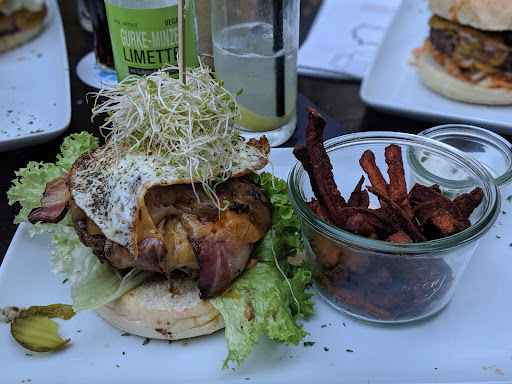 Read moreGerman: Mittags ist es sehr gemütlich sowohl drinnen als auch draußen (natürlich nur bei gutem Wetter). Es war um die Mittagszeit auch überhaupt nicht überlaufen, da das Restaurant trotz Zentraler Lage eher abseits der Sandstraße liegt. Die Auswahl der Gerichte ist sehr übersichtlich und es ist für jeden etwas dabei. Finde es super das man jeden Burger auch als Vegane Variante bestellen kann da ich mir bei 2 oder 3 Vegan/vegetarischen Burger etwas schwerer getan hätte. Dazu kann ich die "shaked fries" mit der cashew aioli empfehlen. Das Essen hat wirklich sehr gut geschmeckt und auch die Veganen Patty's waren erstaunlich saftig. Trotzdem finde ich den Preis für einen Burger ohne Beilage für 16-17€ sehr hoch angesetzt. Mit Beilage und Getränk kommt man pro Person dann gut mal bei 25-30€ raus.