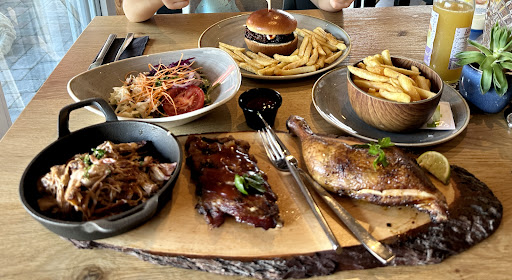 Went here last night with my 7 year old. Had been meaning to try out this place for a while but their opening hours are a bit limited. Nevertheless, glad we made it over here. The atmosphere of the place is quite nice considering it's a wood "diner" like restaurant. I really dig it and found the decor and general "feel" of the place to be just right. I also found the people working here to be very courteous and kind. When I called about a reservation they were nice on the phone and this attention to being polite extended into our visit and throughout. Five stars for sure when it comes to service and if you like this style of laid-back restaurant, also five stars for that. Now on to the food. A bit torn about this. First things first....I'll be coming back. My son also loved his Julius burger and especially the fries. He said these were the best he's ever eaten and we spend a lot of time in the US so he has good comparables. Happy kid so that's already one reason to return and we only live one town over. I had the BBQ platter. It had the pulled pork, the ribs, chicken leg, salad and fries. The salad was great as were the fries. Five stars there. The chicken was good but not great. It could have been a bit more "done"...the skin was a bit too moist for my liking. Finally, the ribs and pulled pork is where I see a chance for improvement. I told my server this when she asked me how things were. Both were a bit on the bland side when it comes to seasoning. I found they could have had a bit more bite and flavour when it comes to what one would expect from pulled pork and ribs. I am spoiled as I grew up with access to really good stuff in the US. Don't get me wrong...this place is far better than basically anything else offering similar in and around Hamburg. I just wish they'd go a bit harder on the seasoning and add more flavour to the pulled pork and ribs. These are dishes where it is all about the seasoning.