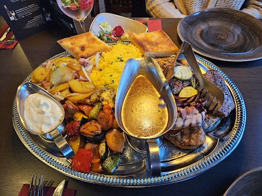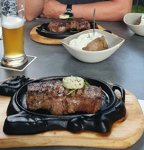 Read moreBedingt zu empfehlen Ich hatte mir Steak und Champignons bestellt. Dazu gab es eine ofenkartoffel mit Sour cream und einen kleinen Salat, der aber offensichtlich am Dressing vorbeigelaufen ist😂 Auf Nachfrage bekam ich dann noch etwas Dressing nachgeliefert. Ich hatte meine Steaks Medium bestellt. Auf dem Teller befanden sich drei kleinere, die leider alle nicht Medium waren und zudem durchzogen mit Sehnen. Als der Kellner sich erkundigte ob alles okay ist, habe ich dies verneint und ihm erzählt was los ist. Das ist kein Problem, ich habe das gleiche Gericht noch einmal erhalten. Leider war das Steak durchgebraten und wieder mit Sehnen durchzogen. Okay, der Koch kann nichts für die Qualität des Steaks, doch hätte man bereits beim Zubereiten der Steaks die Sehnen sehen können. Der Chef wurde mir an dieses Gericht noch einmal zu bringen oder aber etwas anderes. Ich habe dankend abgelehnt da mir bereits der Appetit vergangen ist. Trotz allem muss ich sagen dass das Personal wirklich bemüht war und durchaus freundlich. Für uns war es der erste und wahrscheinlich auch letzte Besuch....