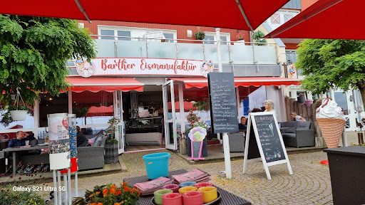 Eine Eismanufaktur direkt im/am Hafen in Barth. Der Blick in und über den Hafen ist sehr gut. Die Tische/Stühle sind mit Glaswänden abgeteilt, so das man windgeschützt sitzt. Zwei Strandkörbe sind auch vorhanden und in der Eismanufaktur kann man natürlich auch sitzen. Eis aus eigener Herstellung in den verschiedensten Geschmacksrichtungen. Das Sortiment ist sehr umfangreich. Die probierten Sorten haber gut geschmeckt, wobei mir das Vanille-Eis zu stark nach Bourbon-Vanille geschickt hat. Muss sich jeder selbst von überzeugen. Das Schokoladen-Eis fand ist sehr gut, wie den gesamten Schoko-Eis-Becher. Der Schweden-Eis-Becher war ebenso sehr gut. Mit einer Kugel Erdbeer-Eis (hat sehr gut und natürlich nach Erdbeeren geschmeckt), Vanille-Eis, Apfelmus, Sahne und dem Eierlikör war der Eisbecher echt super. Der Gag ist die Mini-Tasse auf der Spitze des Eisbecher. Die kann mit Genuss (und Eierlikör) verzehrt werden. Das Personal war sehr schnell und aufmerksam. Meine Frage nach Softeis wurde kompetent, höflich und mit einem Hinweis auf die eigene Eisherstellung abschlägig beantwortet. Das war durchaus professionell. Der Preis mit 2,- € pro Kugel ist bei der Qualität/dem Service noch ok. Die Preise für die Eisbecher sind ambitioniert. Wenn das Niveau so bleibt kann man es empfehlen. Mit Kindern sollte man das Preisniveau der Eisbecher beachten. Es geht ja auch eine Waffel...