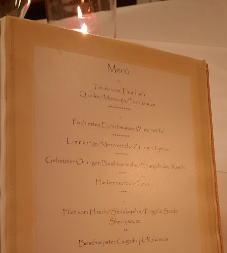 Sensationeller Abend kurz vor Weihnachten. Der Service war herzlich, zuvorkommend und gut organisiert. Absolut lecker gegessen in eleganter Atmosphäre. Wir haben uns sehr wohl gefühlt und einen wunderbaren Abend verbringen dürfen. Preise sind sicher nicht durchschnittlich, betrachtet man allerdings den Wareneinsatz und die Zubereitung der Speisen so ist das fair. Wir müssen uns davon verabschieden das es gutes Essen zum Schleuderpreis gibt ! Wir haben uns zu zweit jeweils für das 7 Gang Menü entschieden und im Vorfeld einen Tisch reserviert (beides ist zu empfehlen). Das Menü bestach durch hervorragende & frische Qualität, perfekt zubereitet und absolut stimmig. Besonderheiten wie z.b eine Lammzunge findet man auch nicht auf jeder Karte. Hier zeigt sich nicht nur die Kreativität, sondern auch die Lust Langeweile auf dem Teller keine Chance zu geben. Mit der Auswahl des Geschirrs in den 7 Gängen ließ sich schnell erkennen das jedes Gericht perfekt in Szene gesetzt werden soll und das ist mehr als nur gelungen. Die Portionsgrößen sind im 7 Gang Menü angemessen, man wird gut satt und geht weder übersättigt noch hungrig nach Hause. Das Verhältnis ist hier ausgewogen. Umbestellungen im Menü oder Änderungen sind jederzeit möglich, wurden von uns allerdings nicht in Anspruch genommen, da kein Bedarf bestand. Danke für den wunderschönen Abend Da unsere Wege bekannt und vertraut sind, wird es sicher ein Wiedersehen geben 😊 und wir freuen uns jetzt...