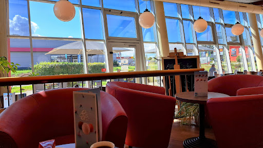 Das Ladengeschäft wirkt großzügig, es gibt viele Plätze, dabei kann man von kleinen Tischen für zwei Personen über große Tische für 6 Personen bzw. einer langen Bank an welcher man viele Tische zusammenstellen bis hin zu gepolsterten launch Sessel wählen. Sanitäreinrichtungen sind ebenfalls gut und die Mitarbeiter recht freundlich. Leider überzeugen mich die Backwaren nicht besonders sie sind nicht schlecht, aber bei solch einer großen regionalkette hätte ich mir irgendwie mehr vorgestellt... Auch fand ich sehr schade, dass man (gerade an der Fernverkehrsstraße) keine Getränke (bis auf Kaffee im Togo Becher) mitnehmen kann. Ich bestellte ein Wasser, woraufhin man vor meinen Augen eine 0,25l Wasserflasche öffnete und mich fragte, ob ich ein Glas dazu möchte. Als ich erwiderte, dass ich diese für später mitnehmen möchte, sagte man mir, dass sie das nicht dürfen mir das Wasser jedoch in einen Kaffeebecher togo umfüllen könne... Enttäuscht willigte ich ein... Ein Wasser aus solch einem Becher zu trinken ist doch...