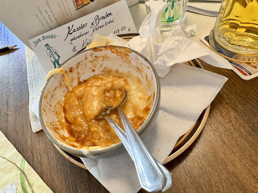 Ein traditionsreiches Lokal - gibt es schon lange in Bautzen - und das Besondere ist natürlich der Bezug zum alten Karasek. Auch draußen lässt es sich sehr gut sitzen. Die Bedienung ist flott und äußerst freundlich. Das Essen ist normal, nix Außergewöhnliches, aber im Großen und Ganzen schmeckt es wirklich gut Was mir aber überhaupt nicht gefallen hat - deshalb nur 3 Sterne - ist die Verwendung von Convenience Food, also vorgefertigte Produkte, die das Leben des Kochs erleichtern. Klar, bei Kartoffeln, Pommes & Co - kein Thema. Aber der gebackene Camembert war einfach nur geschmacklos und zu lange in der Pfanne gewesen. Die Sauce Hollandaise bei der Zunge war mit Sicherheit aus der 5-Liter-Packung. Und dann wird da noch geworben mit "Sächsischen Quarkkeulchen". Man schreibt aber QUARKKÄULCHEN", da das Wort Käulchen von Kaule kommt, was im Sächsischen Kugel heißt. Und die wird in etwa aus dem Teig geformt, bevor dann Portionen abgetrennt und etwas flachgedrückt im heißen Fett ausgebacken werden. In der Tat was Besonderes und was Regionales. Noch besser mit Rosinen drin. Aber wohl denen, die nicht wissen, wie sowas schmecken kann. Ich habe sie schon selbst gemacht. Und ja, das ist ein wenig aufwändig. Aber so, wie die im Karasek geschmeckt haben, das möchte man Gästen wirklich nicht antun. Und man möchte sogar nicht, dass Sachsen - bekannt für gute Küche - mit so etwas in Verbindung gebracht wird. Diese "Quarkkeulchen" waren echt grauslich, hart und fest und recht geschmacklos an Schusters Rappen erinnernd. Bloß gut eigentlich, dass sie auch noch falsch geschrieben sind.