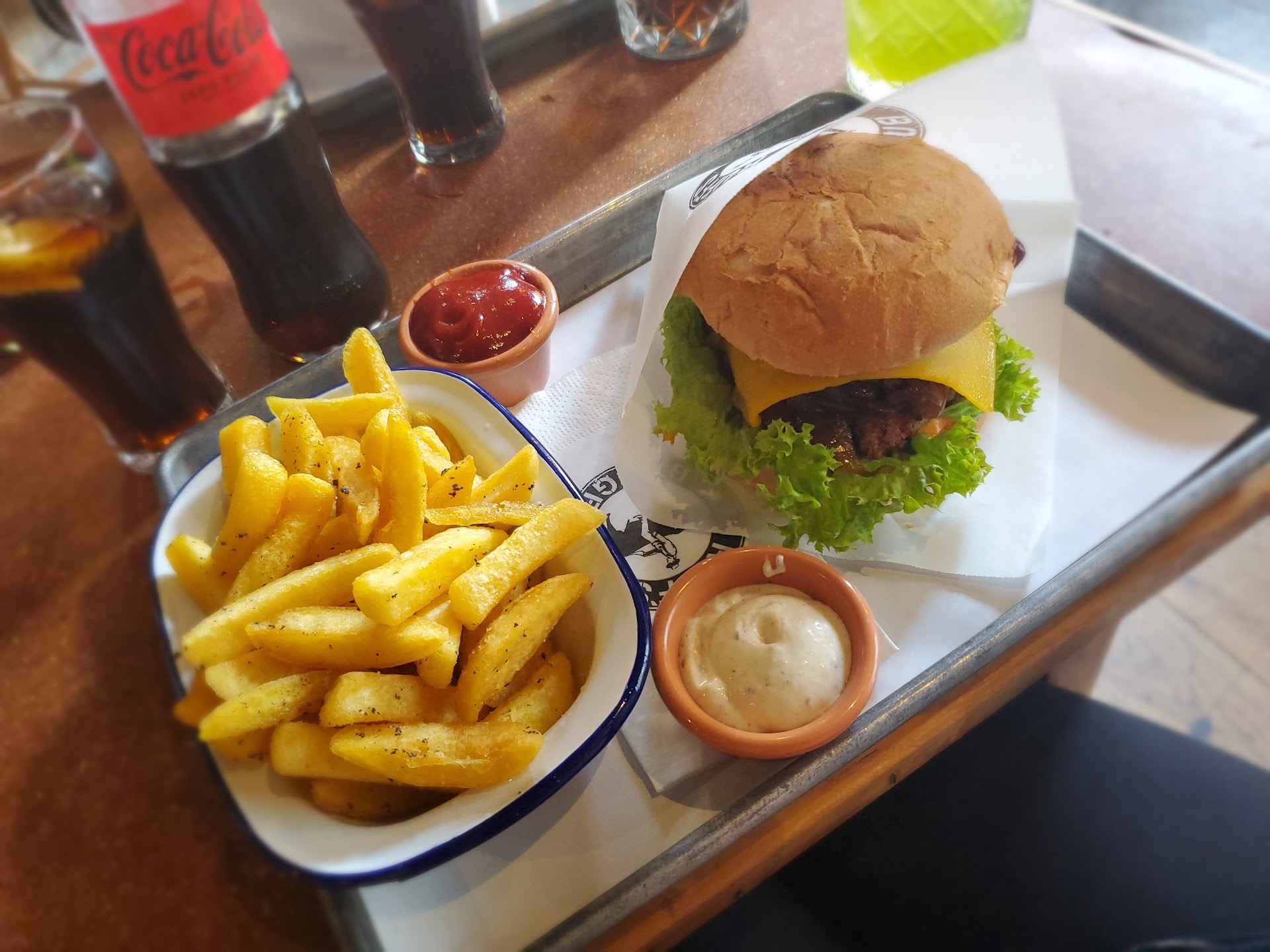 Zum Essen: Wir waren zu 4t und die Kellnerin war sichtlich überfordert unsere Bestellungen wie gewünscht aufzunehmen. Die "Bestellarie" dauerte nochmals knappe 10 Minuten. Ich möchte betonen das wir noch immer die einzigsten 4 Leute im Restaurant waren. Ich möchte nicht wissen wie das ist wenn der Laden voll ist... Die Qualität der Speisen lies sehr zu Wünschen übrig. Von fehlenden Dips über kalte Fleischpatties war alles dabei. Der Cesar Salad war in meinen Augen einfach Verarschung: Paar leicht braune Blätter Salat mit fast keinem Dressing oder Croutons und einem Hauch Parmesan. Dafür stolze 8 Euro verlangen ist frech!