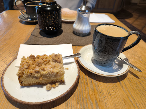 Und die Mohn-Sauerrahmschnitte war extrem pappig, da nicht durchgebacken. Ich habe eine Gabel davon gegessen und dann zurückgegeben. Es gab keinerlei "Entschuldigung" durch die Bedienung. Ein Lächeln und ein "tut mir Leid, mögen's was anderes" wäre schön gewesen.