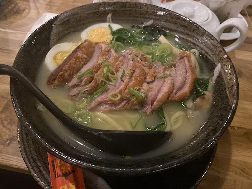 Please do yourself the favor and avoid going here. I’m regularly eating Asian food and I can tell you from every experience I ever had that this one was the worst so far. Once we entered, we got our reserved table very quickly, but that’s where the word “quickly” will appear for the very last time. No one gave us a menu, or asked for ordering drinks, neither for food. For each of these things, we had to reach out to them to ask someone for serving us. I’m fine with waiting for food too, but one hour for some semi warmed up Edamame (some have been cold which lets me assume they have been heated up in the microwave) is simply too much. Then, we needed to wait again more than half an hour for our main dishes, which have been a pure disappointment. We have ordered some vegetarian sushi rolls with Pumpkjn instead of shrimps, but instead we got them with some other kind of fish, even tough the waiter explicitly mentioned the pumpkin while serving them. The ramen was one of the worst I ever ate. The eggs are not cured but plain, the broth tastes like nothing but sour and the noodles are waaaay to thick. Also, the duck hasn’t been cut properly, which makes it super hard to eat with sticks. The waiter seem nice, but I already felt like they’re not even working here because we have been left out any time.