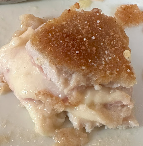 Auch mit meinem Cordon Bleu vom Schwein war ich sehr zufrieden. In einem Gourmet-Schnitzel-Wettbewerb würde es wahrscheinlich nicht den ersten Platz belegen, aber die gleichmäßig verteilte Füllung und das zarte Fleisch haben mich überzeugt. Der Kartoffelsalat, den ich in dieser Zubereitungsform noch nicht kannte, erwies sich als passender und sehr schmackhafter Begleiter.