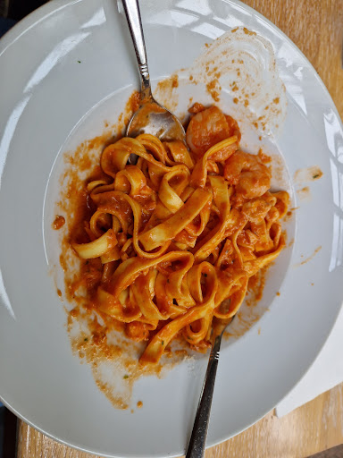 Die Getränke und das Essen war sehr schnell da. Leider war meine Pizza Tonno in der Mitte nicht knusprig, sondern eher weich/ nicht ganz durch, geschmacklich leider etwas Fad was etwas schade war. Die darauf befindlichen Zwiebeln waren zudem noch roh, was den Geschmack auch beeinträchtigt hat. Das Nudelgericht meiner Freundin konnte leider auch nicht ganz überzeugen – die Nudeln ließen sich kaum um die Gabel wickeln, was vermutlich an der Konsistenz der Soße lag. Die Currysoße war eher dünnflüssig und erinnerte an eine nichtabgebundene currysoße. Beide Gerichte hätten insgesamt mehr Würze vertragen können. Vob der Servicekraft hätte ich mir die Frage gewünscht ob das Essen geschmeckt hat oder ob wir noch etwas trinken möchten – hier wäre etwas mehr Aufmerksamkeit wünschenswert gewesen.