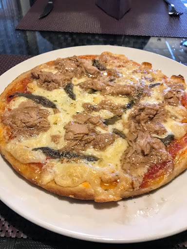 Wir haben Pizza gegessen, war aber irgendwie eher wie so eine Art Keks aus nem Sandwichtoaster aber dafür überteuert. Boden wie ein trockener Keks und der Belag... naja, eine Schinkenscheibe so groß wie die gesamte Pizza, paar Pilze drauf und darunter versteckt tonnenweise Schwerer Käse... Der Rand zwar wunderbar knusprig, aber etwas zu salzig. Spezi dazu, kalt aber sehr wenig Kohlensäure...