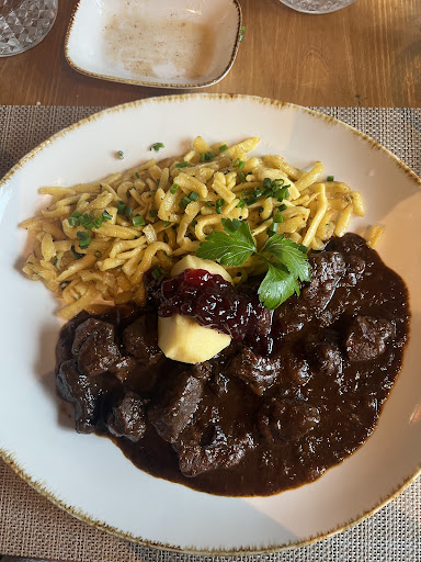 If you are looking for a quick meal, this is not your place. If you are looking for an extended delectable experience with a charming hostess and fantastic food, this is the one. Margaret is so lovely that my fifteen-year-old declared that she wanted to grow up to be her. We have limited German and less French and Margaret helped us to beautiful wine (a riesling), delicious starters (fois gras with multiple spiced confitures and a dish of housemade lox), and finally to perfectly cooked steaks, the local schnitzel variation, and tender venison with cherry sauce. I regret we were too full for dessert. With so much attention to people and detail, nothing is fast and this is just fine. If you get the chance to go, be patient, enjoy the art and the surroundings, and goodness will come to you.