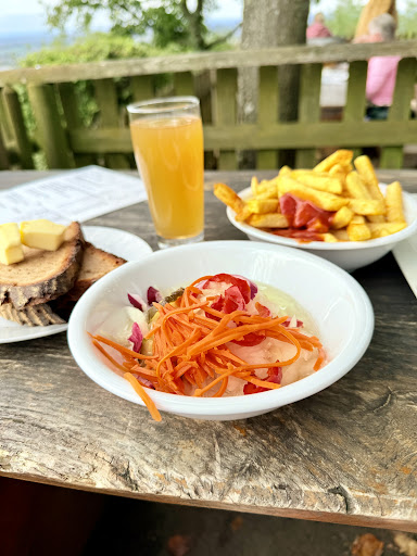 Read moreWir waren das erste und zeitgleich auch das letzte Mal am Kirchberghäuschen. Gefeiert und empfohlen von vielen Bekannten, entschlossen wir uns für einen Spontanausflug bei schönem Wetter. Wir haben unten im Ort geparkt und waren trotz zwei kleiner Kinder in knapp 15 Minuten oben. Die Aussicht war trotz Sonnenschein zwar nett, aber das war es auch schon. Trotz vielen Besuchern hat die Sitzplatzsuche nicht lange gedauert, dank einer ausreichenden Fluktuation. Es gibt reichlich Tische im Außenbereich und auch im Innenraum. Überall war Personal, soweit das Auge reichte, jedoch wohl nur um Gläser und Teller abzuräumen, sehr schade. Selbstbedienung ist angesagt und so stand ich an einer ca. 35-40 Meter langen Schlange bis hoch zum Spielplatz an. Nach knapp 40 Minuten konnte ich dann bei einer sichtlich ungestressten Dame meine Bestellung abgeben. Zur Sicherheit wurde bei jeder meiner Bestellungen 3 Mal nachgefragt und am Ende bekamen wir trotzdem die falschen Getränke. (Nein, meine Logopädin versicherte mir, das es nicht an meiner Aussprache lag). Der durch viele Besucher angepriesene Kaiserschmarn kam zu unserer Bestürzung aus der Mikrowelle. Selbst die Kinder konnten der Süßspeise nichts abgewinnen. Ein großes und ehrliches Lob geht an die Currywurst mit Pommes. Hierbei handelt es sich um eine richtig dicke Brühwurst ohne Darm, die überragend schmeckte, zum fairen Preis! Alle anderen Speisen waren leider unterer Durchschnitt. Das Konzept der Selbstbedienung ist bei hoher Auslastung an seine Grenzen gekommen und bedarf einer Anpassung, insbesondere bei der Bestellung und wenn man schon verständlicherweise nicht just in time kocht, dann doch bitte keine Mikrowelle im Sichtbereich der Küche platzieren (das hat immer einen faden Beigeschmack).