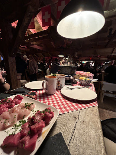 Das Käsefondue war einfach sensationell – ehrlich gesagt, das Beste, das wir je gegessen haben, und das schließt auch unsere Erfahrungen in der Schweiz mit ein! Dazu gab es Brot, zwei verschiedene Kartoffelvariationen und eine Auswahl an Beilagen, die das Fondue wunderbar ergänzten. Auch die Vorspeise und der Nachtisch ließen keine Wünsche offen. Rundum ein gelungenes Menü.