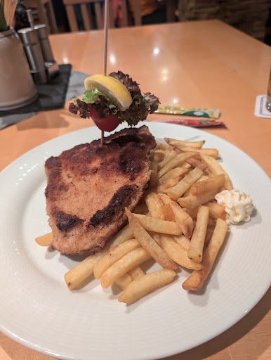 Read moreSchon beim Betreten des Gastraums wurde ich von einer sehr freundlichen und bezaubernden Dame begrüßt. Ich fühlte mich direkt wohl und erwünscht. Schnell einen Tisch gefunden, obwohl sehr viel los war. Da ich an einem großen Tisch saß kam zunächst noch ein Pärchen dazu und dann noch ein Pärchen mit Tochter. Gegessen habe ich ein sehr leckeres Cordon Bleu mit Pommes, dazu auf Empfehlung einen Beilagensalat und ein Helles. Es hat alles sehr lecker geschmeckt und ich kann nur empfehlen dort essen zu gehen. Bis zum Ende war die Dame die bedient hat aufmerksam, immer ein nettes lächeln im Gesicht und zuvorkommend. Am Ende mit einem lieben Fürti und schönem Abend verabschiedet worden. Obwohl das Restaurant total voll war, hatte man nie den Eindruck, dass die Mitarbeiter gestresst waren. Ein ganz tolles Erlebnis und ein schöner Abschluss des Tages. Auch wenn das Cordon Bleu nicht ganz so schön angerichtet war und etwas dunkel, war es sehr...