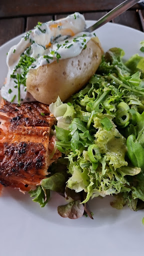 Flammlachs mit Ofenkartoffel und Salat, 18€ der Teller und ich rechnete bei dem Preis mit vielem.