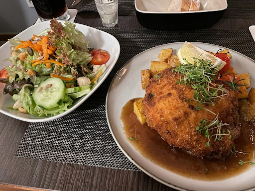 Anschließend Getränke und Essen bestellt. Für mich Kalbsschnitzel mit Bratkartoffeln und Preiselbeeren/ Salat. Von einem Sternekoch habe ich mehr erwartet. Es hat geschmeckt, mehr aber auch nicht. Die Apfeltarte war auch lecker.