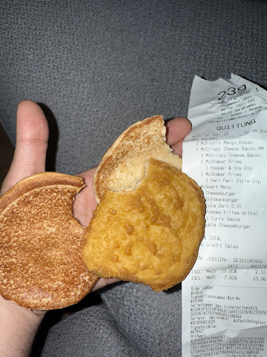 Da unsere Tochter natĂŒrlich wie jedes Kind auf die Monopolysticker abfĂ€hrt und genau wusste das auch auf den Pommes Sticker drauf sein mĂŒssten, welche Info auch am Terminal so ausgeschrieben war, schaute sie natĂŒrlich auf die Pommes und stellte fest das diese fehlen. Also haben wir den jungen "freundlichen" Herrn darauf angesprochen. Als Antwort auf unsere Frage ob auf den Pommes nicht fĂŒr gewöhnlich auch Sticker drauf seien, entgegnete er "scheinbar ja wohl nicht, sonst wĂ€re es ja drauf." Nun gut dieser Vorfall war natĂŒrlich schon Ă€rgerlich, vor allem der unterirdisch schlechte Service und weniger die fehlenden Sticker, aber nicht allein der Grund fĂŒr eine Bewertung auf Google.