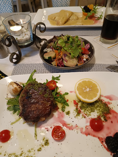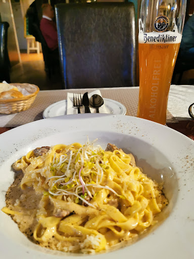 Ordered 2 rump steaks with chanterelle sauce for me & my husband, daughter and boyfriend had Carbonara and a pizza... the 2 steaks were meant to be medium but arrived rare, nor had they been left to rest so made the sauce very watery and not much flavour, the side of potatoes & vegetables was not cooked long enough so hard ... pasta was bland but pizza was ok.... when it came to paying we Were told CAsh only !! This should have been explained when we ordered food and not after it was consumed... what would they had done if we didn’t have the 99 euro cash that the bill came to on us? As we drank beer it was not an option to drive to a cash machine....would not dine here again but hotel...