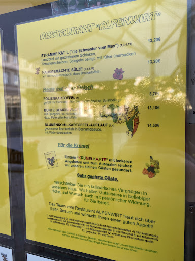 Read moreWir waren gerade zu zweit beim Alpenwirt in der Karl-Marx-Allee. Trotzdem es Sonntag gegen 16.45 Uhr war, sind einige Gäste im Lokal gewesen. Wir konnten uns einen Platz aussuchen und haben einen Fensterplatz in der Nähe der Theke ausgesucht. Nach etwas Wartezeit wurden uns die Speisekarten gebracht. Die Preise im Internet, auf der Seite speisekarte.de sind nicht mehr aktuell und die Webseite des Restaurants ist nicht zu erreichen. Die Allergene sind nicht auf der Speisekarte aufgelistet. Die Karte wirkt sehr verspielt und ist mit diversen Bildern versehen. Das Service Personal scheint nicht besonders motiviert oder geschult zu sein. Offenherzig und gastfreundlich sind die Mitarbeiter an diesem Tag nicht. Besonders Verkaufstalent (z.B. Nachfragen ob es noch etwas zu trinken sein darf oder ein Dessert) war nicht vorhanden. Der Kanninchenrollbraten (17,90 Euro) und die Gänsekeule (24,50 Euro) waren gut, aber nicht besonders ausgefallen anrichtet und zubereitet - sehr klassisch und einfach. Da die Gänsekeule mit Knochen serviert wird, wäre ein Teller zum Ablegen der Knochen schön gewesen. Der Rosenkohl zum Kaninchen scheint selbst zubereitet zu sein und kommt nicht unbedingt aus dem Tiefkühlfach. Die Theke sieht etwas rummelig aus. Neben vielem Klimbim sieht man eine bunte Mischung an verschiedenen Gläsern und aufgetürmte Schnaps-Flaschen. Unter der Decke hängen Geweihe mit Kunstblumen. An den Wänden gehört zur Dekoration ein großer Kopf eines ausgestopften Wildschweins. Trotzdem viel herum steht oder hängt sieht es sauber aus. Vermisst habe ich auf der Getränkekarte Almdudler. Es gibt nur Standard Getränke. Wir waren durchschnittlich zufrieden. In dem Restaurant steckt noch einiges...