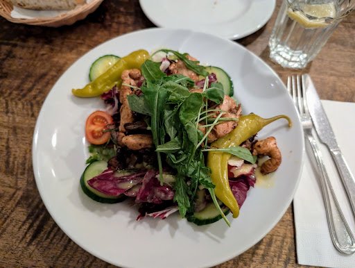 The Schnitzel, crispy and flavorful, paired well with the Bratkartoffel. The salad with grilled chicken was solid, with the chicken cooked perfectly juicy. However, the Flammkuchen could have used a bit more salt and a few extra minutes in the oven, as it wasn’t quite as crisp as it should be.