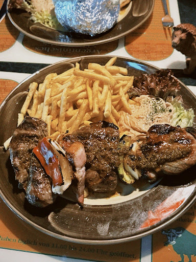 Das, was dann auf den Tisch kam, in meinem Fall ein Mixedgrill mit einer recht dünnen Scheibe Schweinefilet, einem kleinen Rindersteak und einem kleinen Streifen Lamm und einer Ofenkartoffel mit Sauerrahm und Röstzwiebeln für 19 € war qualitativ okay. Fleisch ohne jedes Salz oder Pfeffer. Auf dem Tisch stehen dann kleine abgepackte Portionen Salz und Pfeffer, die man sich selber nehmen kann. Wie gesagt normale bis gute Qualität insgesamt aber nur befriedigend, die Mitarbeiter sollten wirklich mal geschult werden und mehr...