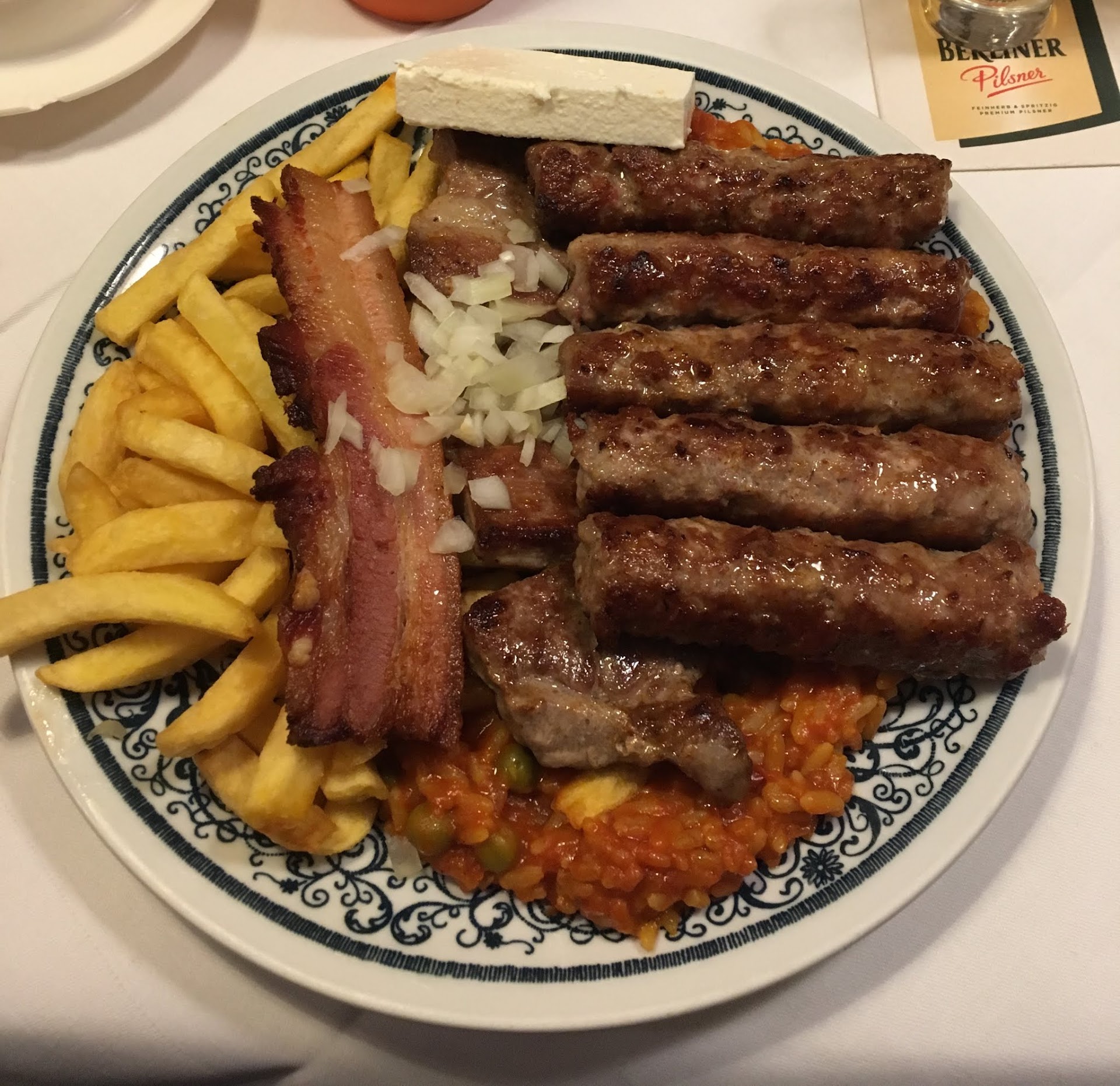Etwas später hatte ich erst die #211 Trio-Platte mit Cevap und Currywurst und dann den Cobanskiteller mit 4 Scheiben Schweinefleisch, Djuvec-Reis, Pommes, Zigeuner-Gemüse und Omelette, Salat. Alles sehr lecker! Die Salate zu den Gerichten sind auch sehr gut, z.B. auch mit Schafskäse.