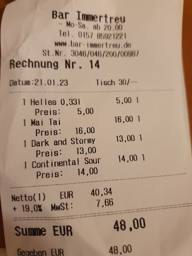 Read moreVisited Bar Immertreu last night and had one of the worst service experiences I've encountered in Berlin. The bartender was unwelcoming and rude from the moment we walked in. After being seated, we waited 20 minutes just to receive a menu and place an order. Then we waited another 20 minutes only for the bartender to return and tell us he'd completely forgotten about our order. To make matters worse, the bartender appeared to be intoxicated while on duty. At that point, we'd had enough and decided to leave.
